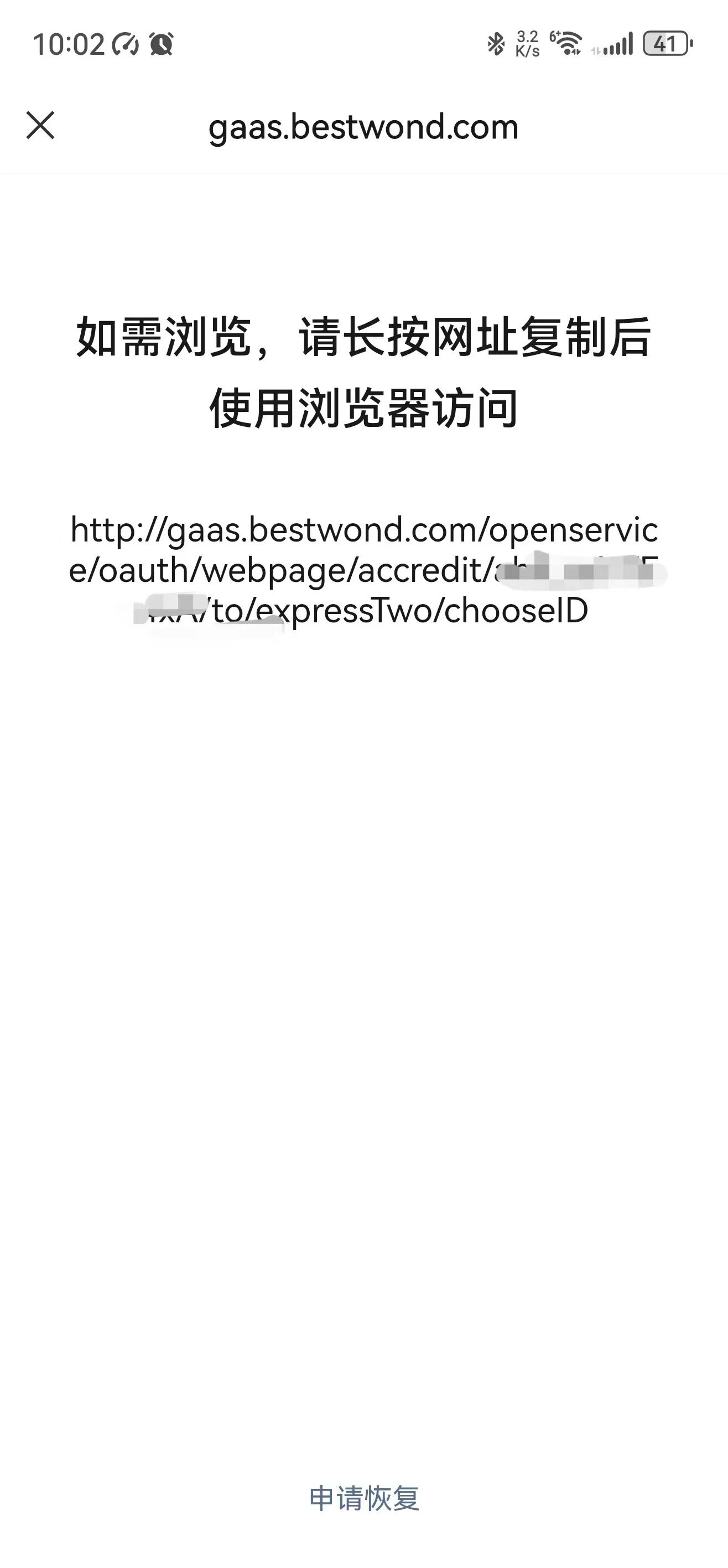 我们是快递柜服务,用户通过链接进入后,扫描快递柜上二维码,进行取件使用。属于便民服务,目前个别地区使用无法进入,提示【如需浏览,请长按网址复制后使用浏览器访问】,服务是根据开放平台对接的,放在普通浏览器中无法使用。