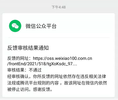 具体违规情节:违反了《微信外部链接内容管理规范》第19条,详细规则请参考《微信外部链接内容管理规范》http://weixin.qq.com/cgi-bin/readtemplate?t=weixin_external_links_content_management_specification