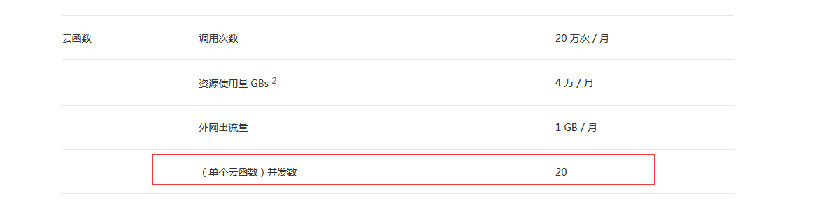 这里的并发并不等于 QPS,如果你的一个函数的处理时间是 100ms 那 20 个并发就是 200 QPS,以此类推。此外,你这个从哪里看到的,这个信息是不对的。现在的云函数最大连接数已经改到 1000 了,每次处理 100ms 的话,最大 QPS 就是 10000,官方文档:https://developers.weixin.qq.com/miniprogram/dev/wxcloud/billing/quota.html#quota_footnote_func_concurrent