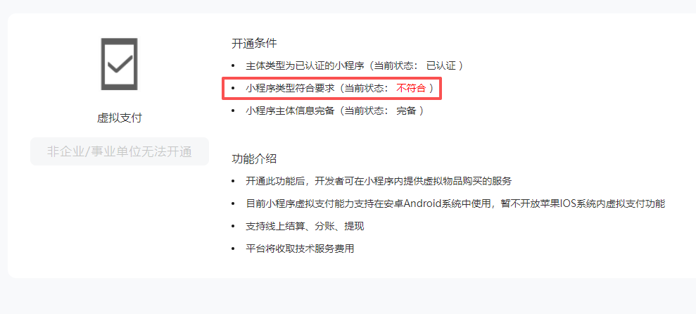 1.如图所示,我目前是个体工商户,这个小程序是个体工商户为主体的小程序,那么这个小程序无法开通虚拟支付吗,所以个体工商户不算企业吗,但为什么有些页面里个体工商户又算企业的子类?
