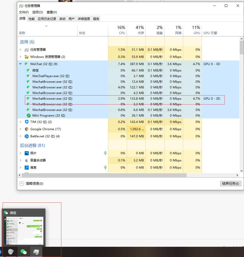 电脑端微信在关掉bilibili视频后,后台WechatBrowser.exe进程会自动在后台播放视频,并且没有任何地方可以关闭,只能通过结束进程来关闭。