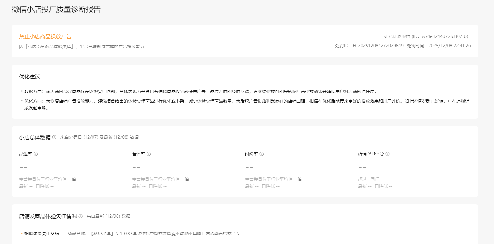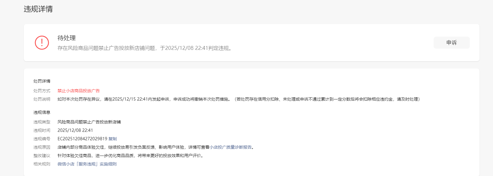 1、新店开业,看到微信广告有托管,成交了才付费,就充了点钱准备托管,广告计划还没跑呢,突然告诉我被处罚了?封禁了广告?