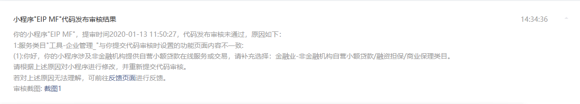 本小程序作为企业管理工具,提供正常的借款,报销服务,仅限于内部员工,审批以【你的小程序涉及非金融机构提供自营小额贷款在线服务或交易,请补充选择:金融业-非金融机构自营小额贷款/融资担保/商业保理类目为由拒绝。】