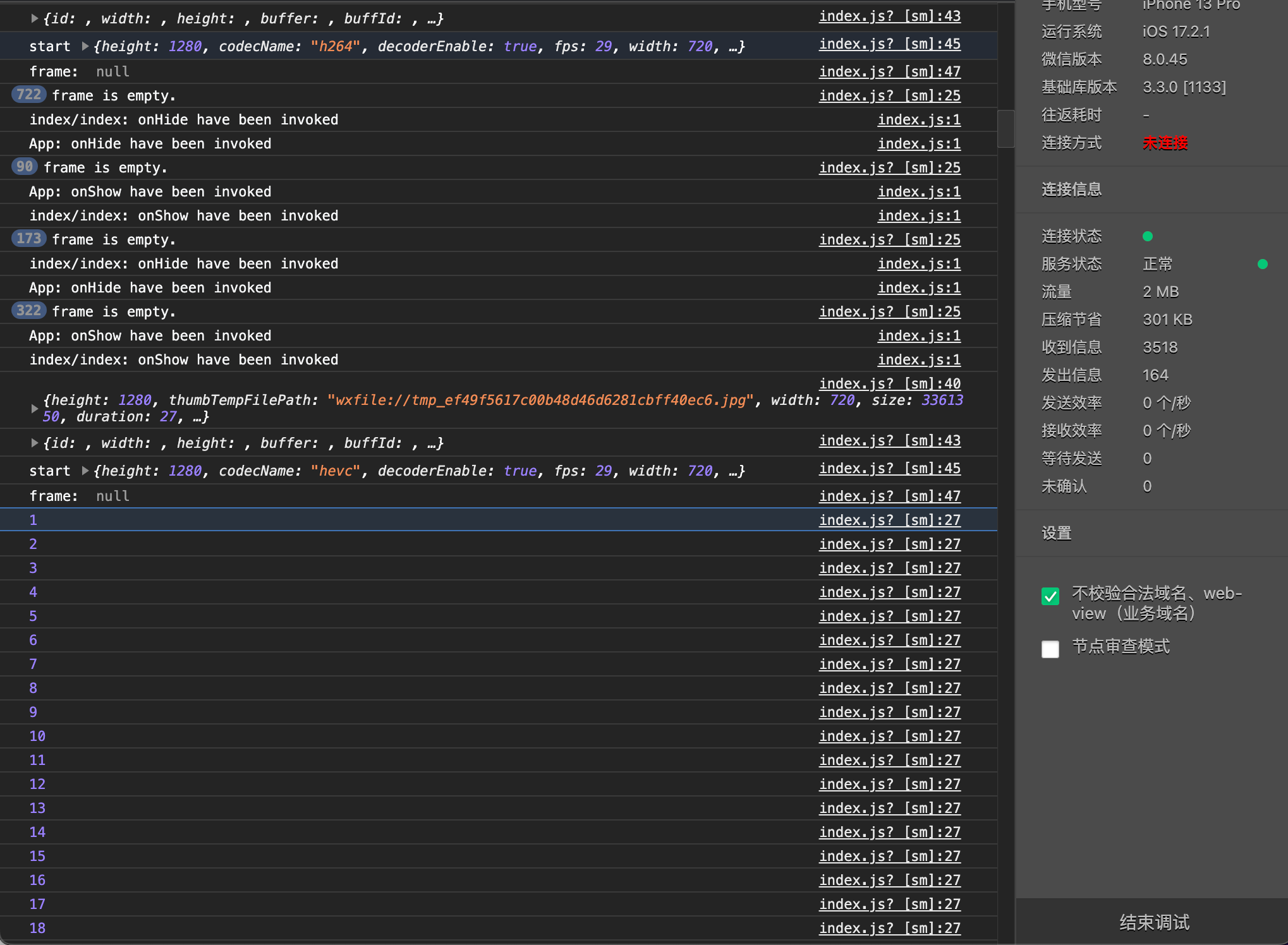 代码片段附上,可以观察到控制台输出,当hevc解码的时候,console里会有已解码帧的数量打印出来。而当h264的时候,getFrameData一直为null打印出来。