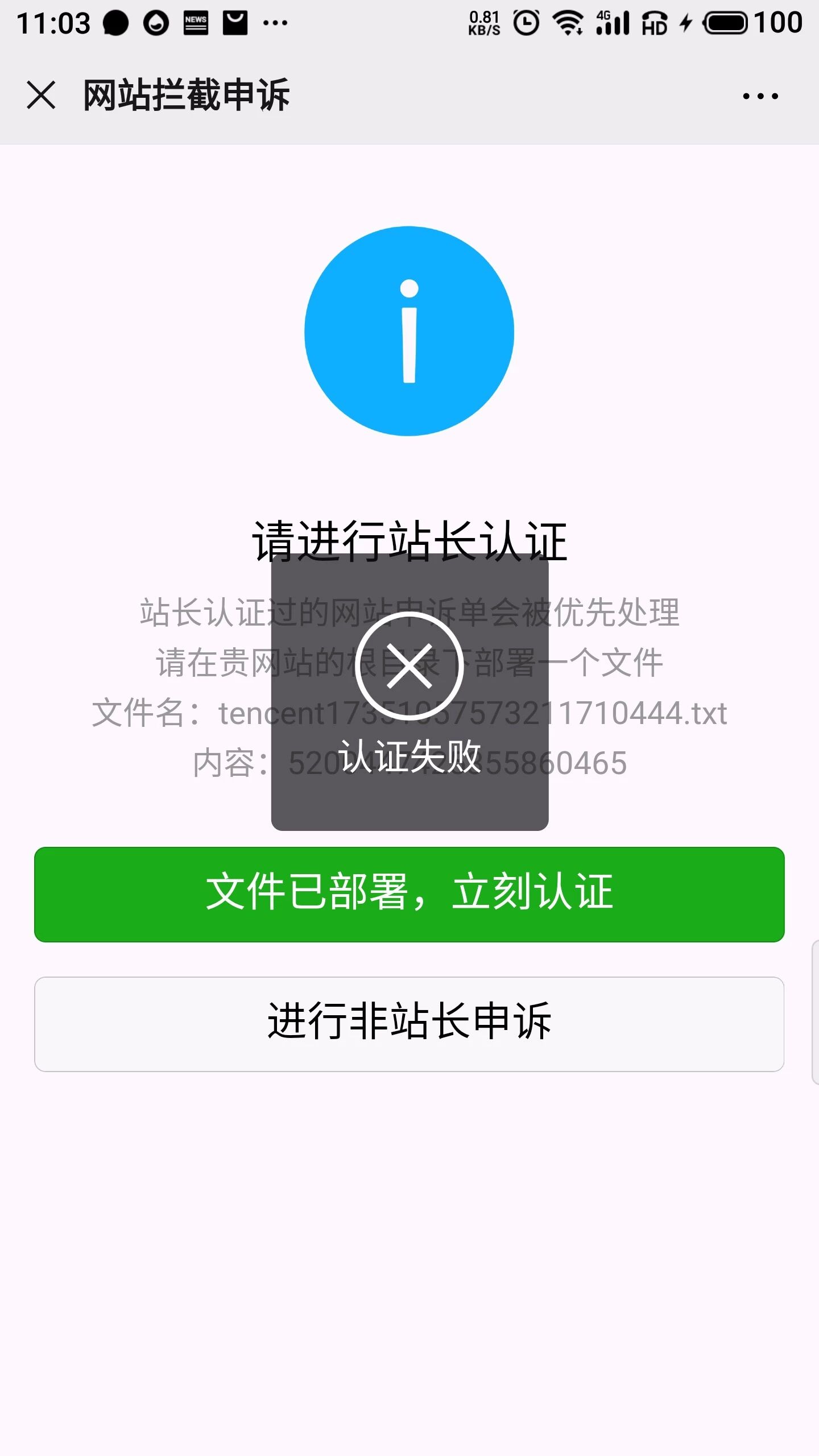 你好 我是www.chichisvip.com的站长,是做博客性质的技术分享,电影分享,小软件等信息的博客,并没有恶意所说的恶意程序,可能是误封,昨天下午五点的时候我吧网站一个帖子分享给了多个群, 之后再打开就不行了,关于申诉,站长认证一直显示失败,文件已部署 只能提交非站长认证了 可是都没有回复 ,麻烦相关工作人员可以帮忙解决,谢谢