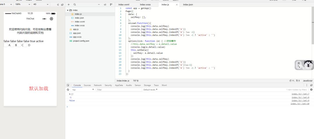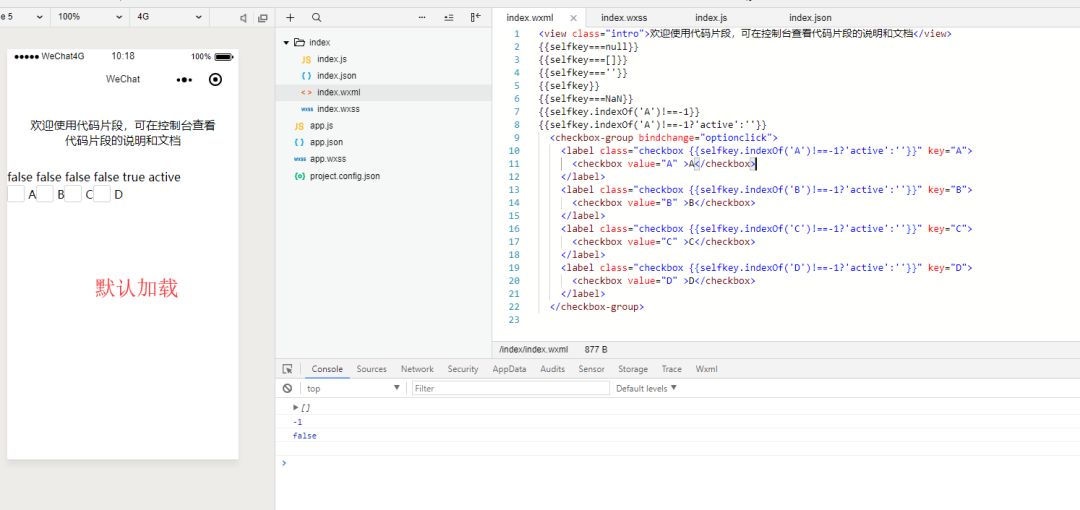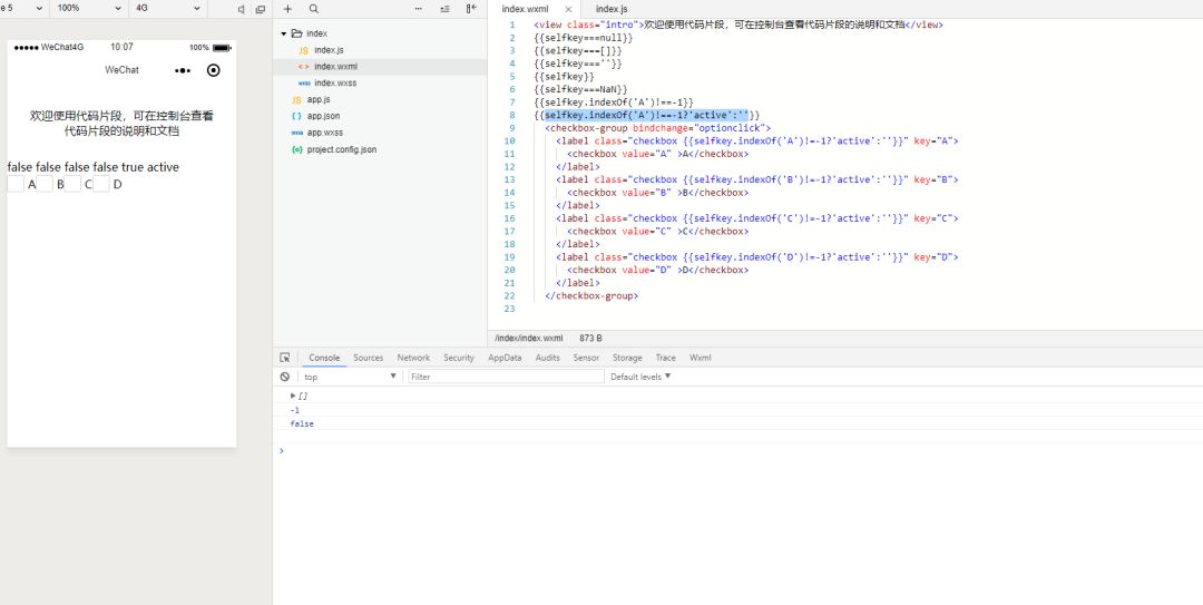 在wxml里的直接写 {{list.indexOf('A')==undefined}}