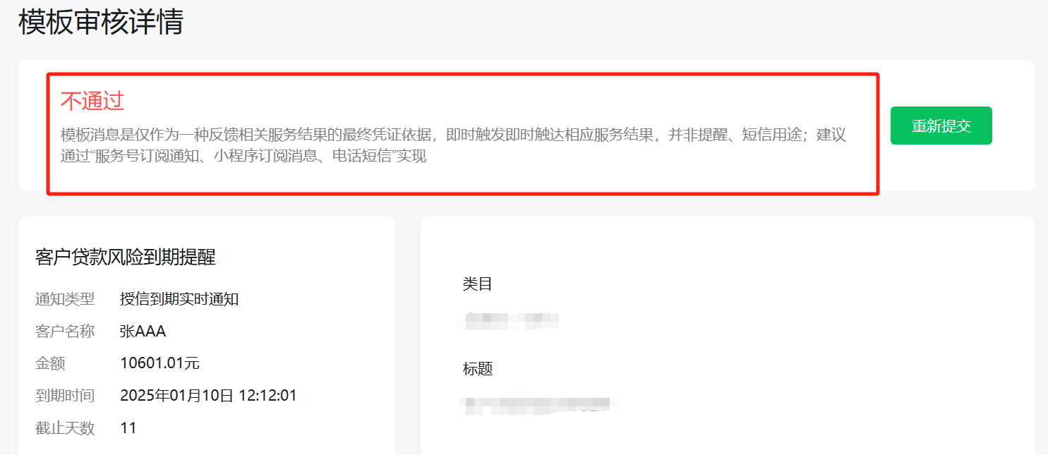 你好,该号gh_04dc15b9c5a3最新提审类目模板申请,标题【客户授信类到期结果通知、客户授信类到期监测通知】等模板,驳回原因及修改建议如下: