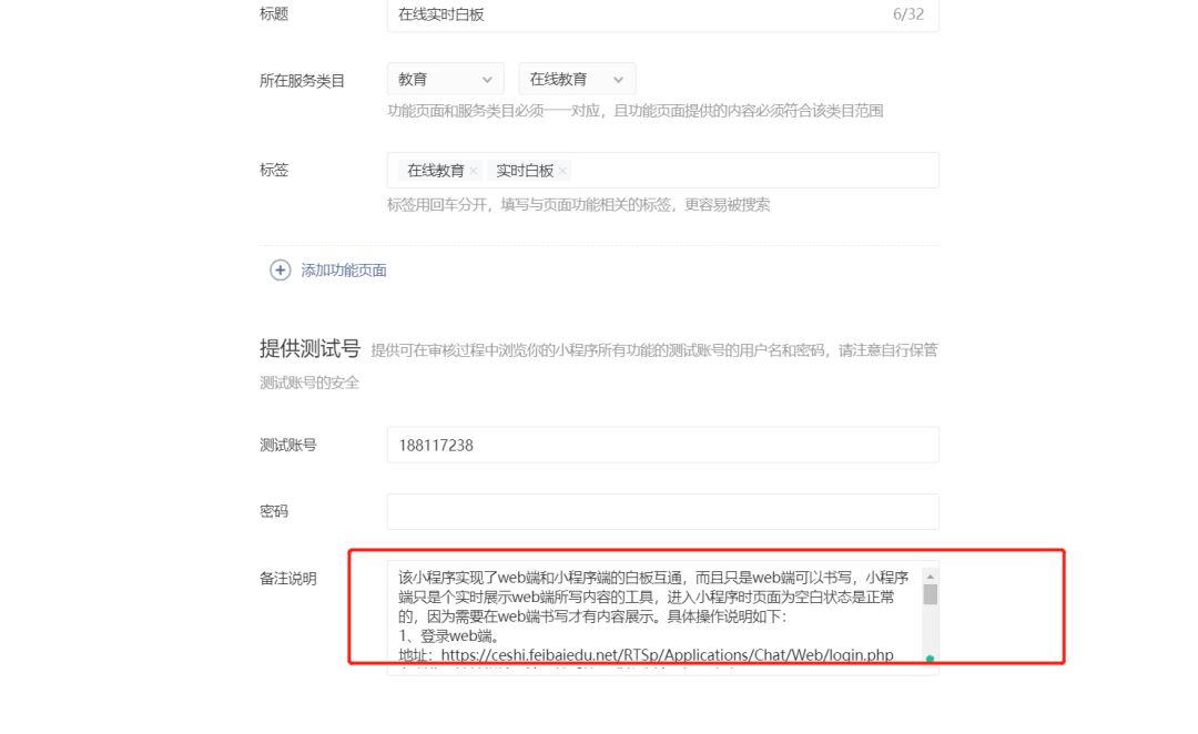 我就想问,到底我还要提供怎么的信息才能让我审核通过???我都在备注里写了好几次操作使用说明了,现在还是跟我说因为我的页面空白不让我过,我小程序端的白板只是个展示,不能书写,只能实时复现web端的所写内容,我也一直强调这一点,然后给了web端地址和账号密码以及操作说明,现在依旧不给我过,这个程序我已经重复提交了10天了!!!10天了!!!!!