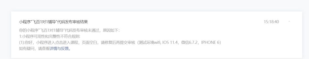 你好,经核实,贵方小程序输入教室号后,点击进入课程,页面空白,功能无法体验,请修复后再提交代码审核