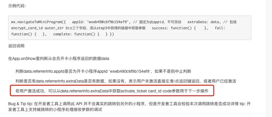 因为开完卡后直接跳到会员卡展示页面,我还以为开完后直接跳回我自己的小程序呢,要这样说来,不能获取到倒是真的奇怪,但现在看来,我要自己手动一步一步的返回自己的小程序,不能获取到貌似也很合理,但是文档这么写,即便我真的获取不到也不好反驳啊。