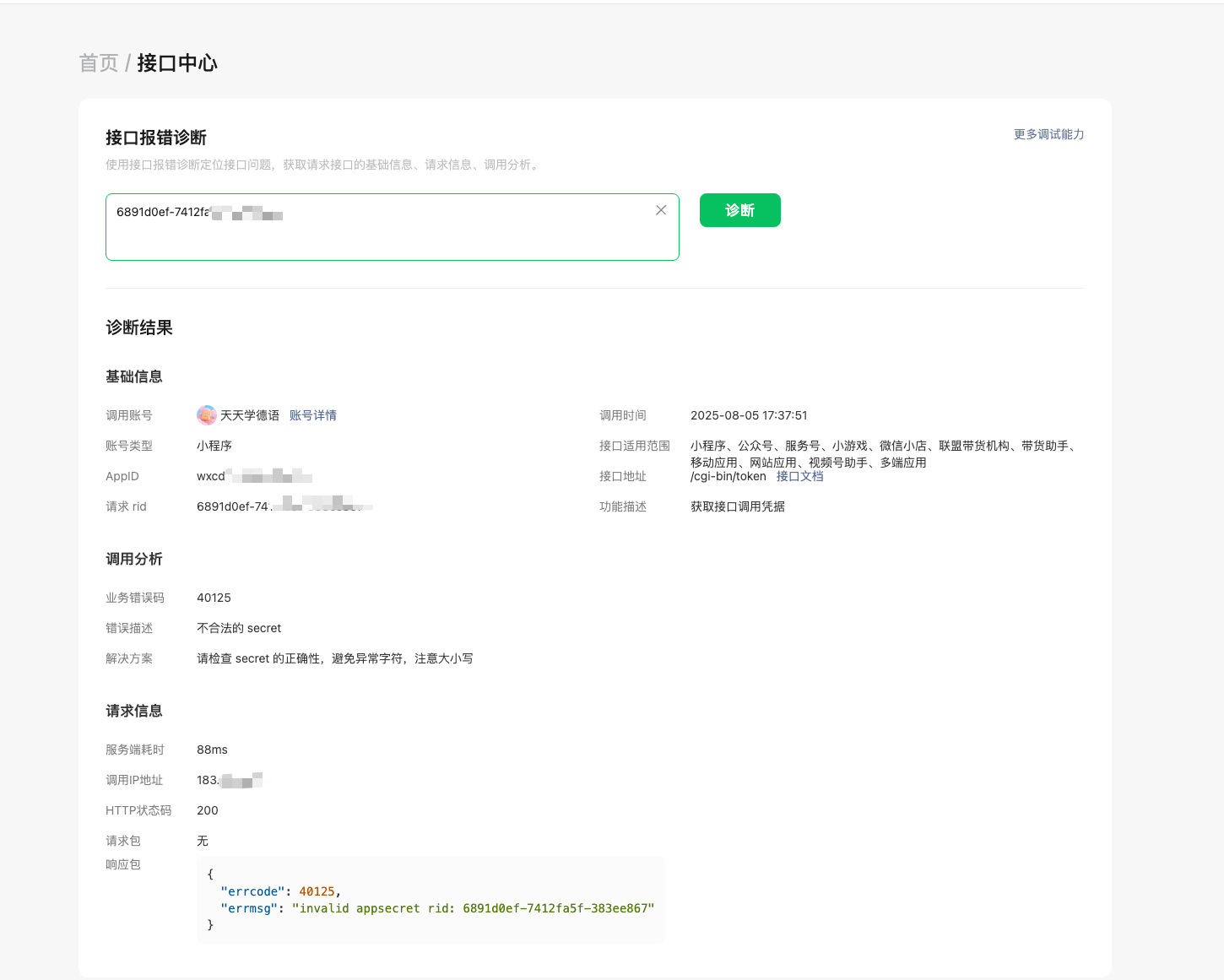 首先,非常感谢微信开发者平台团队持续为开发者赋能。新上线的「接口报错诊断」工具是一个直击开发痛点的优秀功能。在过去,通过 `rid` 排查接口错误往往需要多方查阅文档、社区提问甚至凭经验猜测,耗时耗力。该功能将分散的排查过程集中化、自动化,极大地提升了定位问题的效率,是开发者调试路上的“及时雨”。