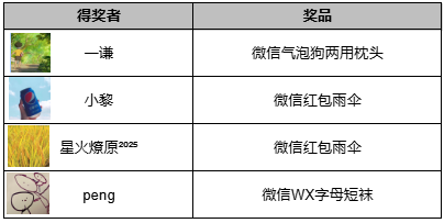 我们精选以下 4 位用户的回答并送出微信周边礼物。2025 年 9 月 3 日前,我们将通过社区私信联系以上得奖者确定邮寄地址,如本周内未收到回复(即 2025 / 9 / 7 0点前),视为放弃奖品。