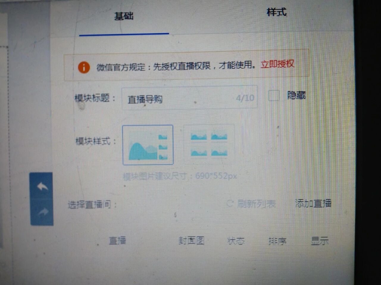 1、你这个是第三方的后台;2、你重新授权一下你的第三方,勾选直播权限即可。