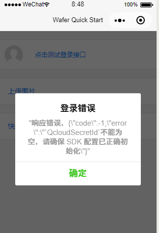 {"code":-1,"error":"QcloudSecretId不能为空,请确保 SDK 配置已正确初始化"}遇到这个错误的原因是:腾讯不再帮助用户无感知的申请腾讯云云 API 密钥,受此影响,腾讯云微信小程序解决方案 Wafer2 提供的 sdk.config.json 中的 qcloudSecretId 和 qcloudSecretKey 字段将为空,这会导致登录失败,并返回错误提示:ERR_REQUEST_PARAM。