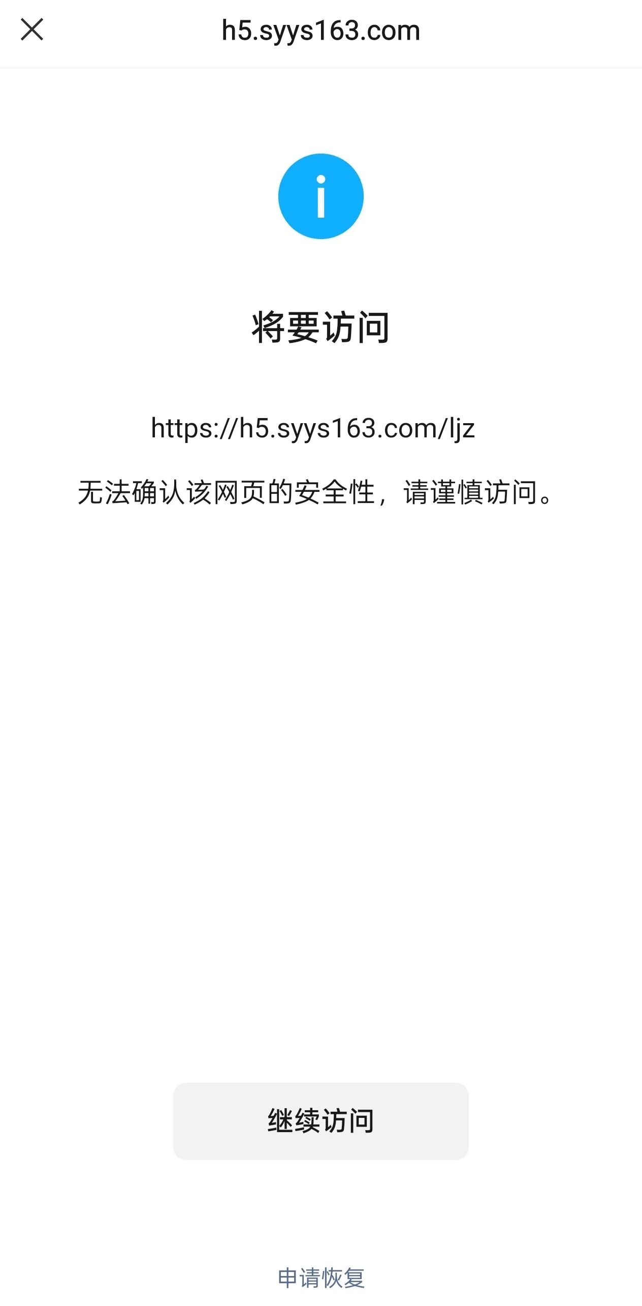 您好,域名(https://h5.syys163.com/ljz)域名在腾讯云注册并备案通过,服务器也在腾讯云,浏览器访问正常,我是网站开发者,访问时间如图微信访问网站出现“无法确认该网页的安全性,请谨慎访问”,经检查网页里没有不安全的内容,请核实后帮忙解除拦截,谢谢!