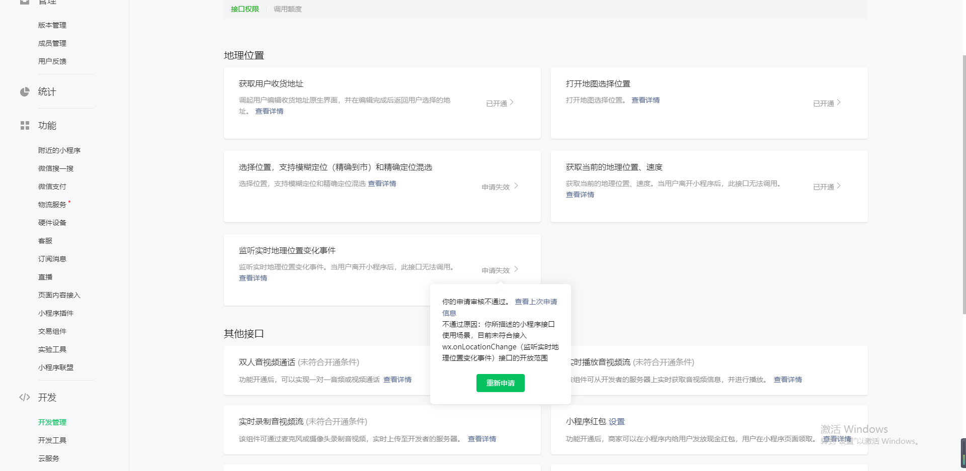 你好,核实到小程序申请wx.onlocationChange接口审核不通过,根据提交的申请信息可知申请该接口是用于【线下门店自提服务,以及跳出其他导航app进行导航服务】,小程序内未含有需监听用户实时运动轨迹的使用场景。不符合wx.onlocationChange接口使用场景开放范畴。详情参考:https://developers.weixin.qq.com/miniprogram/dev/api/location/wx.onLocationChange.html