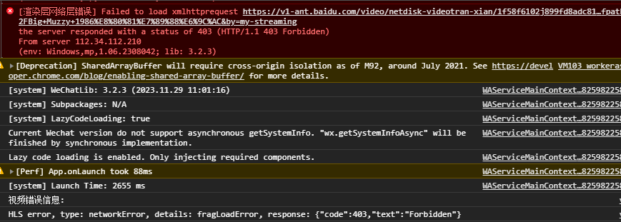 我从百度网盘接口获得m3u8文件,存储到云开发中,将对应的File IDcloud://cloud1-9gsn6k5c***.m3u8直接替换https://developers.weixin.qq.com/miniprogram/dev/component/video.html示例代码中的src,微信开发者工具中先次8次报错服务器返回403,video组件binderror的错误信息为:HLS error, type: networkError, details: fragLoadError, response: {"code":403,"text":"Forbidden"}