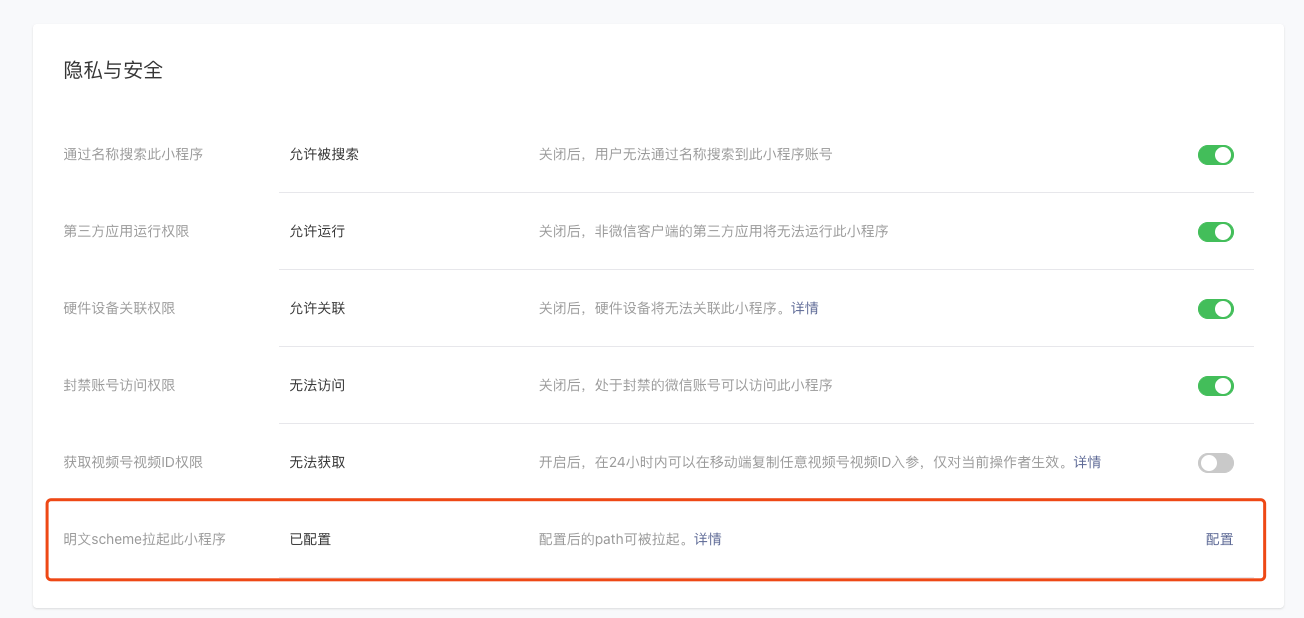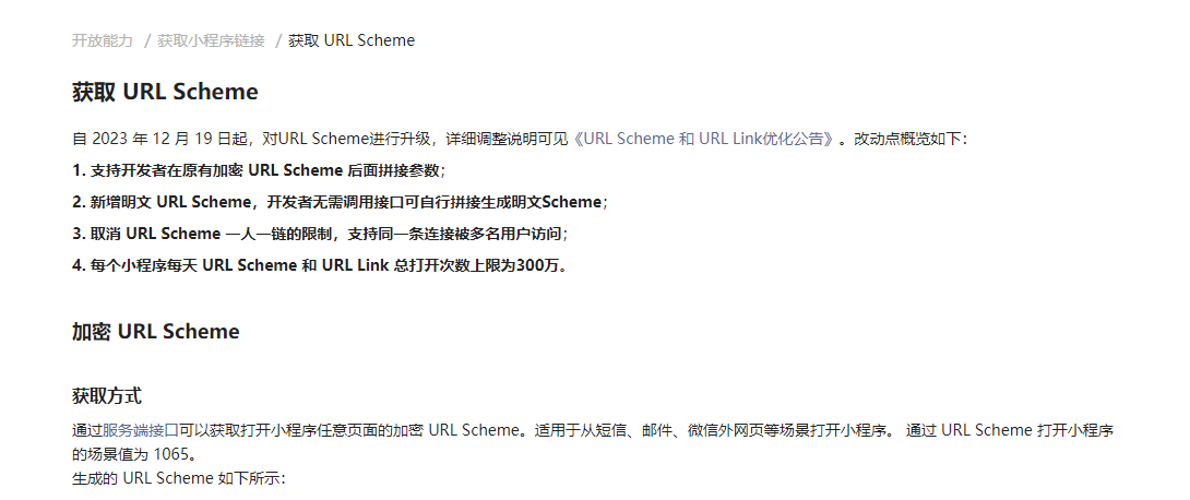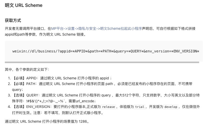 可以了解下明文 URL Scheme,这个不需要调用接口:https://developers.weixin.qq.com/miniprogram/dev/framework/open-ability/url-scheme.html#%E6%98%8E%E6%96%87-URL-Scheme