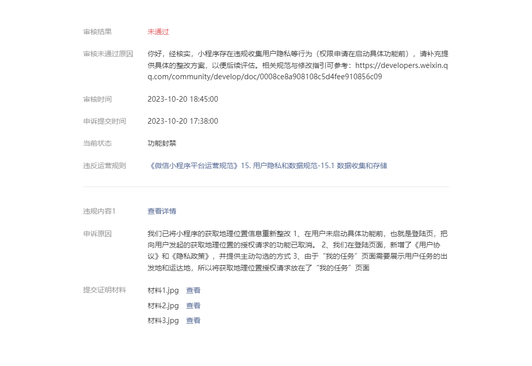 你好,经核实,小程序存在违规收集用户隐私等行为,请补充提供具体的整改方案,以便后续评估。相关规范与修改指引可参考:https://developers.weixin.qq.com/community/develop/doc/0008ce8a908108c5d4fee910856c09