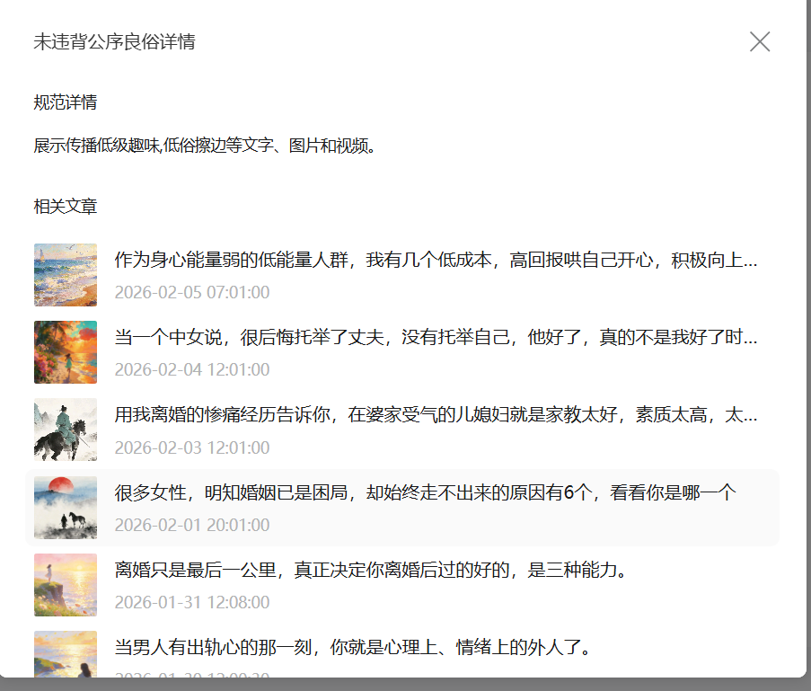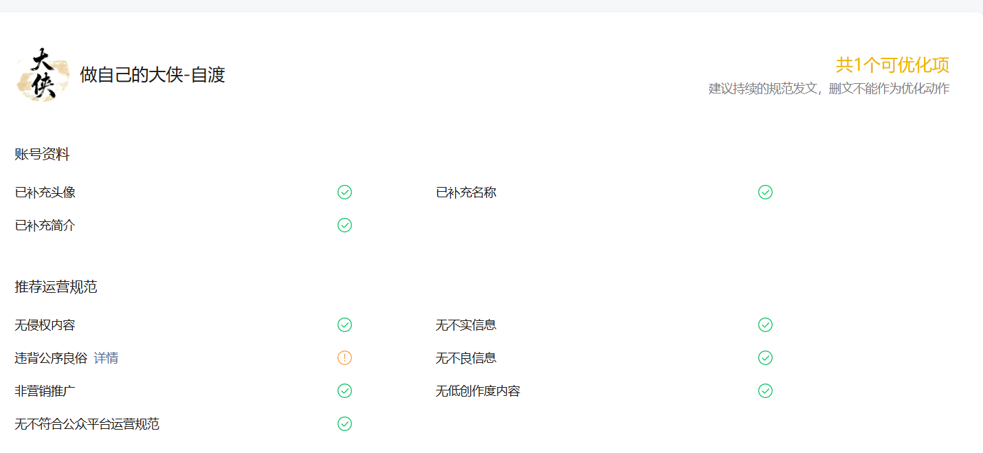 您好!我的公众号 “做自己的大侠 - 自渡”,账号检测页面显示 “违背公序良俗” 异常,但【违规记录】中无对应记录,也无申诉入口。问题反馈后,系统通知:审核通过,账号状态以恢复正常。问题文章已误删无法优化,账号持续限流无推流。请协助核查并清除异常状态,恢复账号正常推荐。