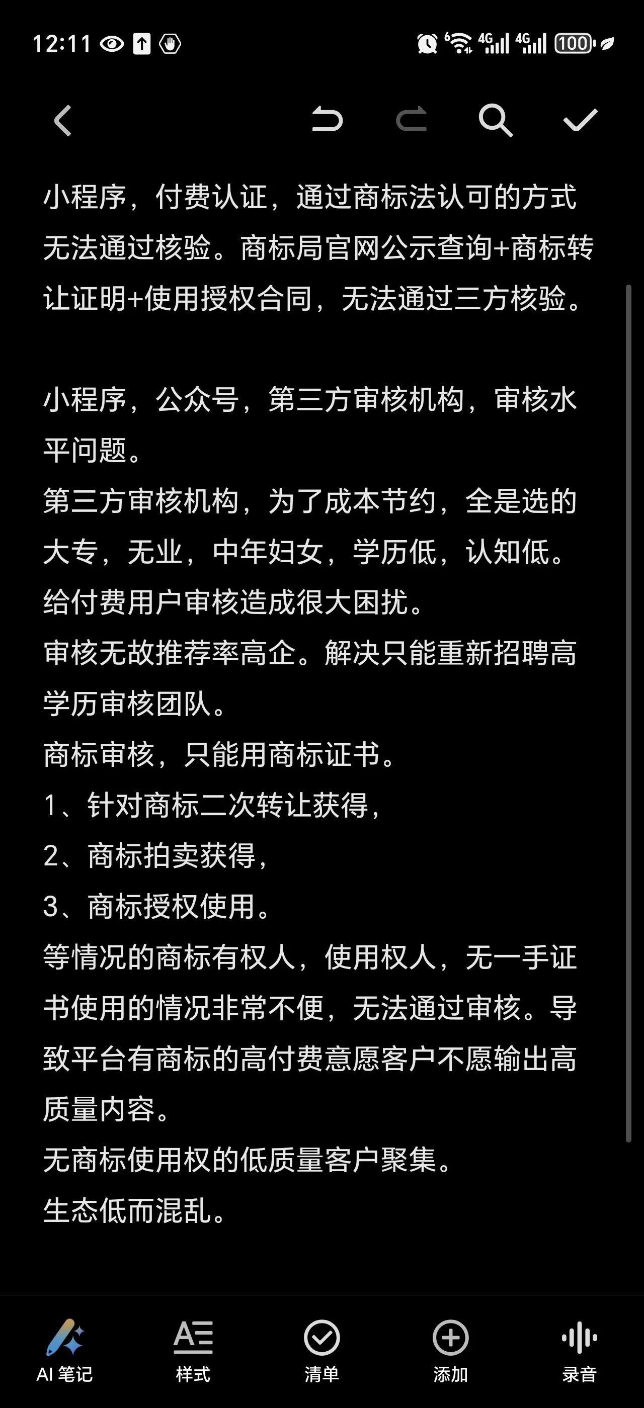 小程序,付费认证,通过商标法认可的方式无法通过核验。商标局官网公示查询+商标转让证明+使用授权合同,无法通过三方核验。 小程序,公众号,第三方审核机构,审核水平问题。 第三方审核机构,为了成本节约,全是选的大专,无业,中年妇女,学历低,认知低。给付费用户审核造成很大困扰。 审核无故推荐率高企。解决只能重新招聘高学历审核团队。 商标审核,只能用商标证书。 1、针对商标二次转让获得, 2、商标拍卖获得, 3、商标授权使用。 等情况的商标有权人,使用权人,无一手证书使用的情况非常不便,无法通过审核。导致平台有商标的高付费意愿客户不愿输出高质量内容。 无商标使用权的低质量客户聚集。 生态低而混乱。