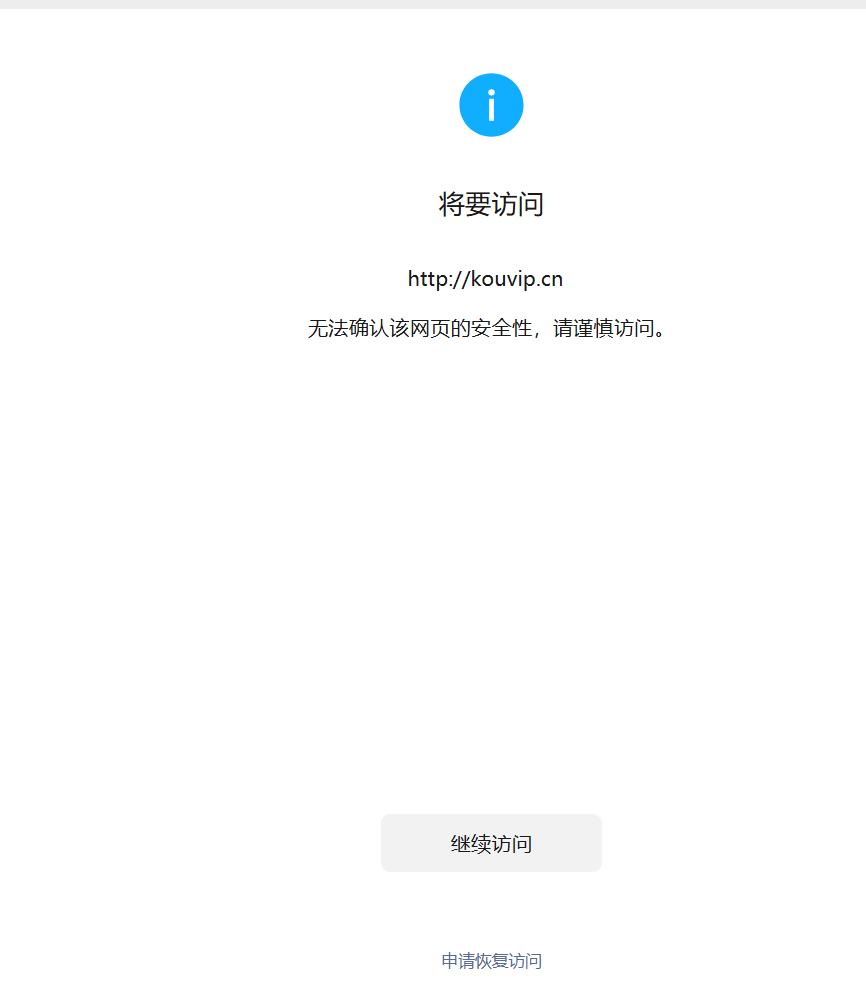尊敬的微信开发社区管理员,本人的域名:kouvip.cn。在微信点几下就出现了拦截,需要点继续访问。