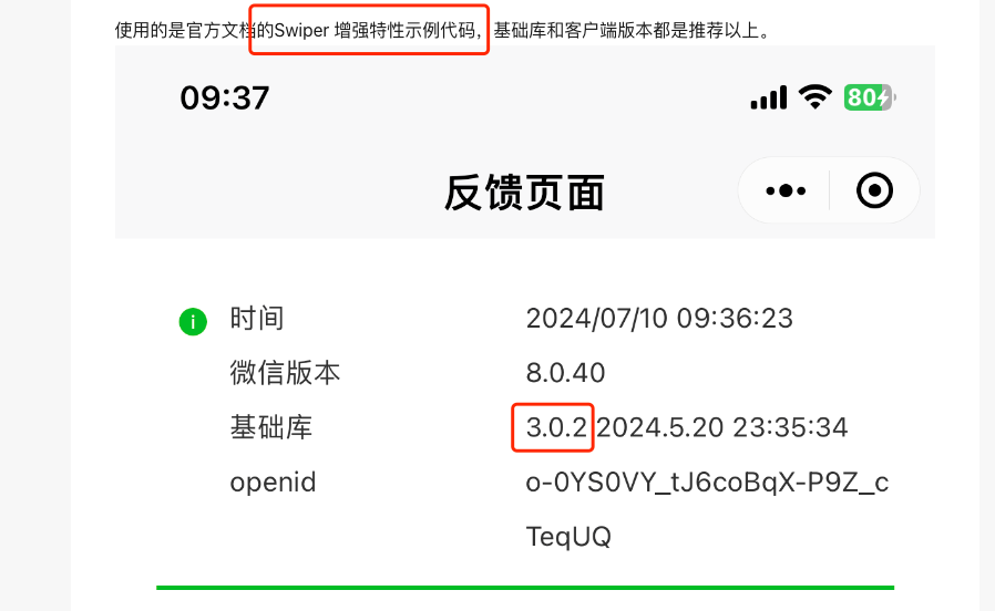 使用的是官方文档的Swiper 增强特性示例代码,基础库和客户端版本都是推荐以上。
