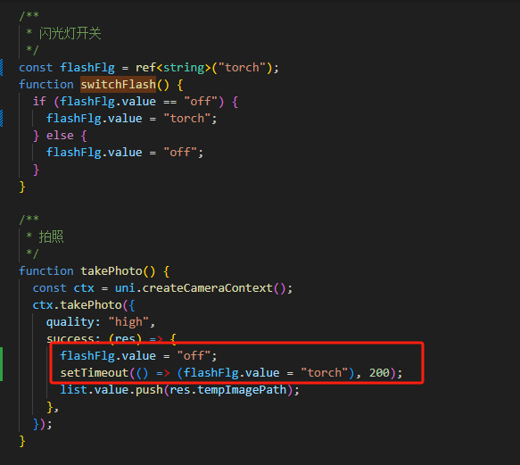 找到个暂时性的解决办法,在success后,重置flash状态为"off",再延时回调设置flash状态为"torch",如下: