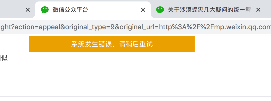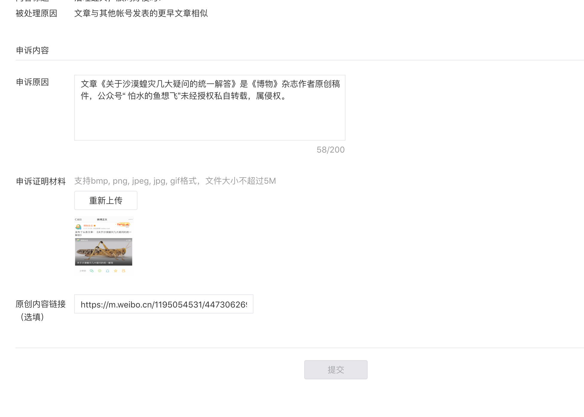 “博物”公众号要发布的作者原创文章,被其他账号提前抄袭而无法贴原创标签。进入申诉通道后,点击提交一直显示“系统错误,请稍后再试”,无法申诉。