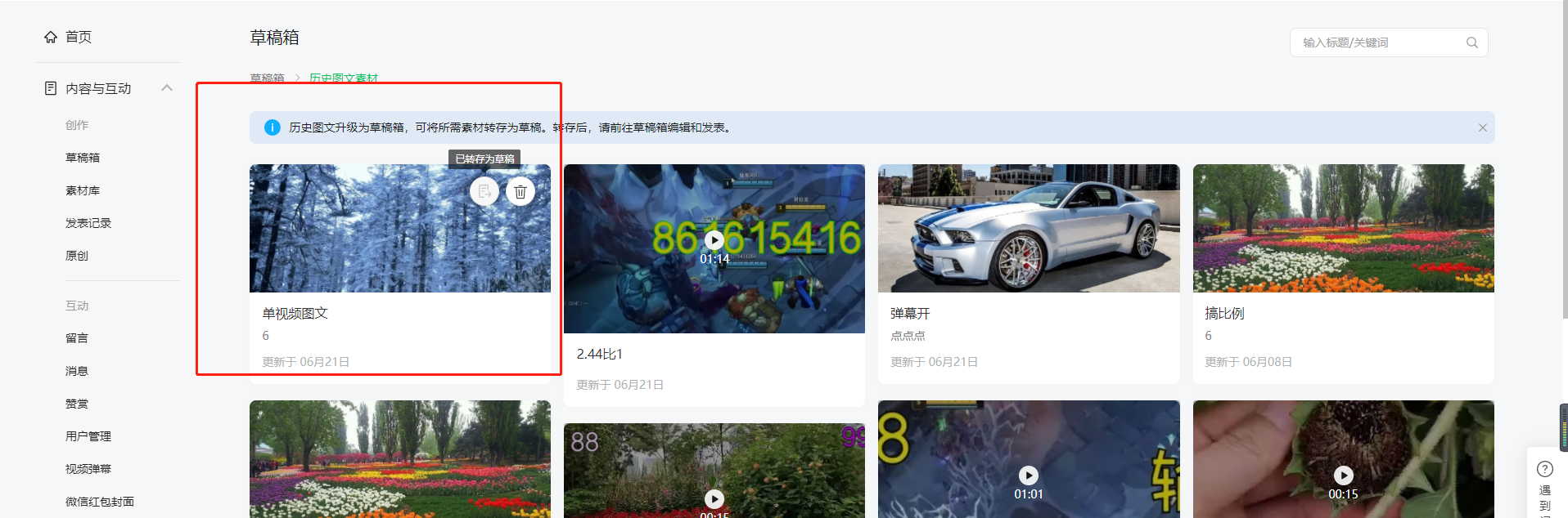 提供历史图文素材库已转存的素材截图,以及草稿箱中对应截图