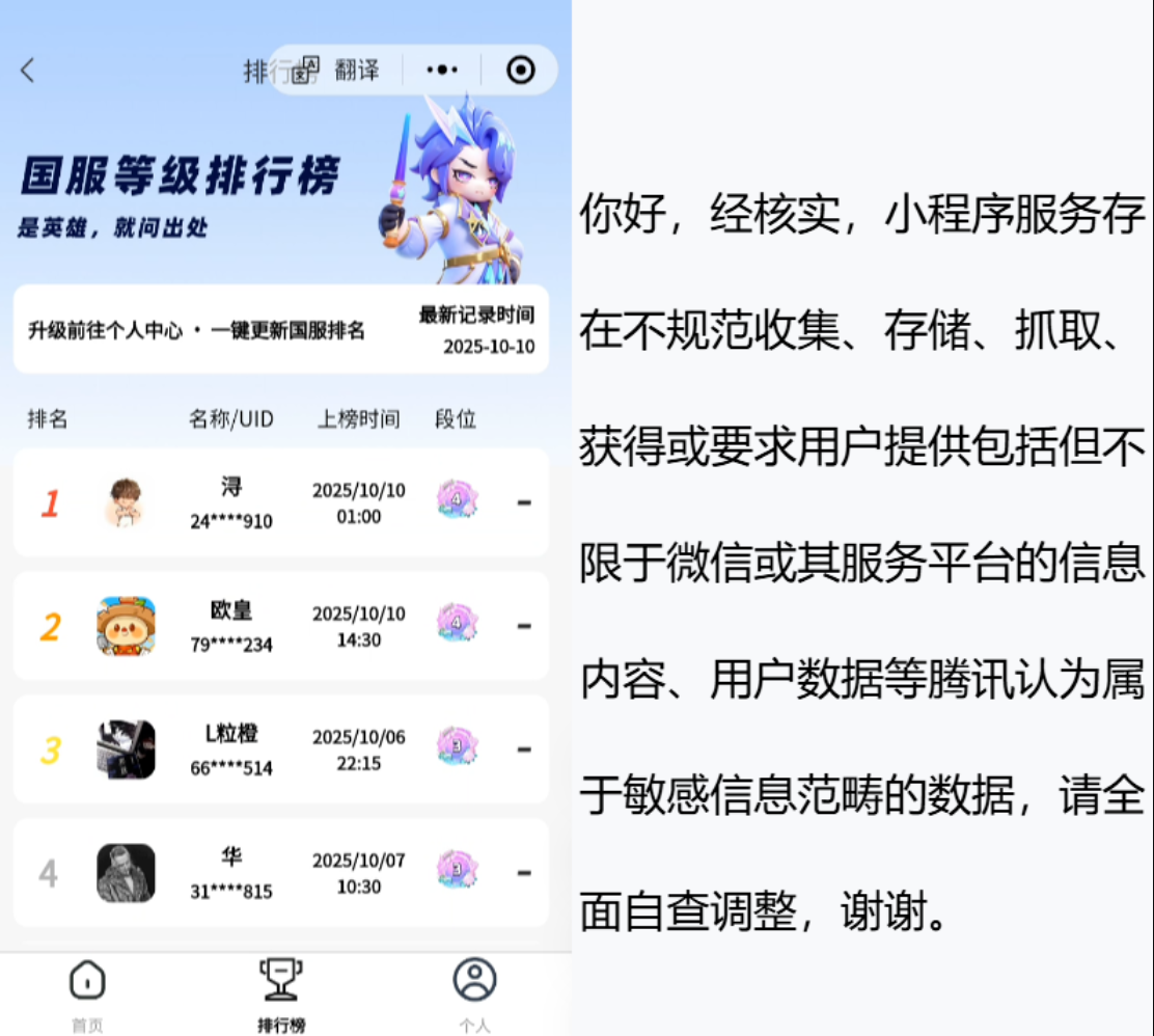 3、排名的uid原先是完全显示,出现问题后,我方已经将uid进行部分隐藏,仍然不通过审核,