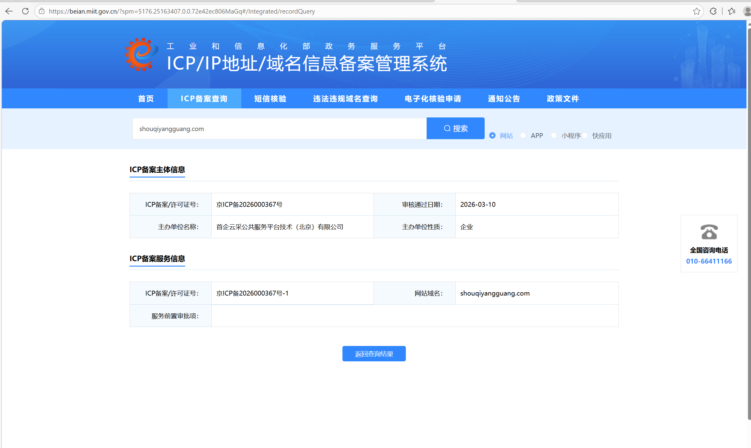 www.shouqiyangguang.com 为首企阳光招采公共服务平台官方网站,已依法完成ICP备案,属于合法合规运营网站。