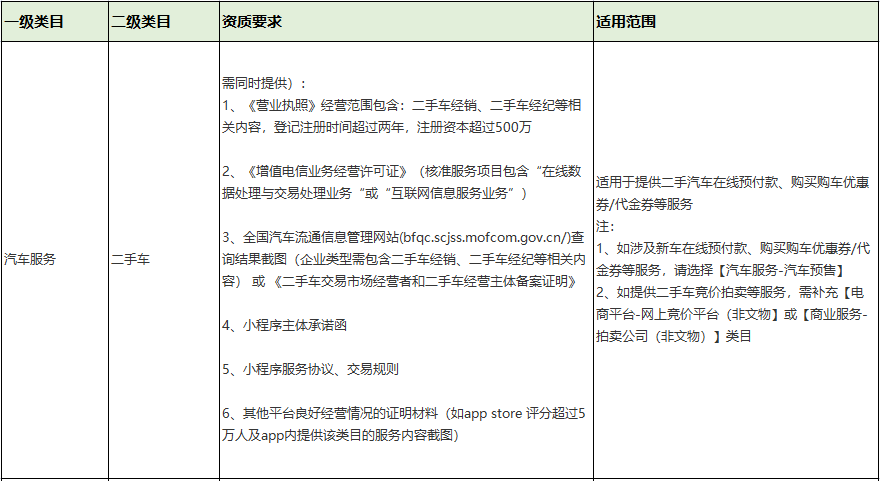 代码审核环节,将会对小程序运营的内容与所选类目是否相符进行核实,当小程序涉及提供二手汽车在线预付款、购买购车优惠券/代金券等服务,需要补充【汽车服务-二手车】类目合规提审,否则代码审核环节将面临因类目不符被驳回情形。