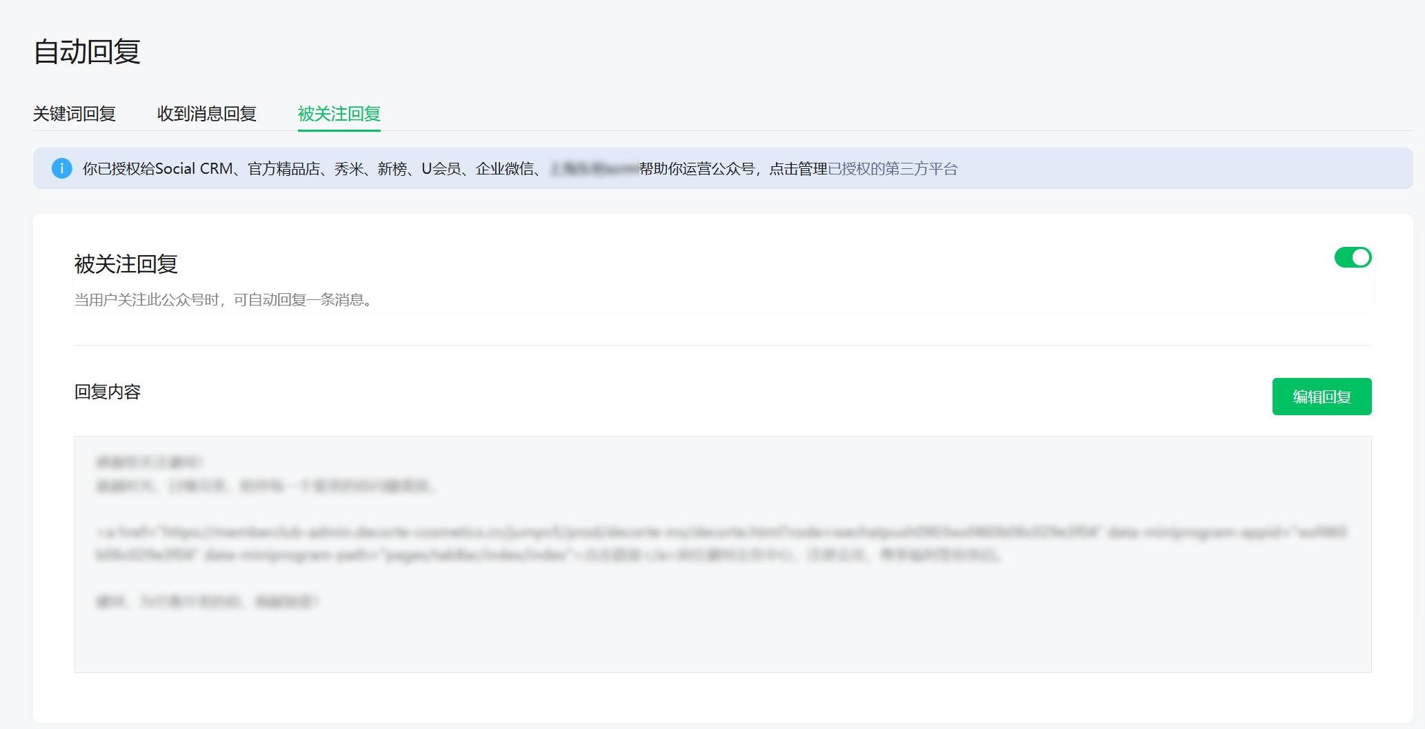 后台设置过关注后自动回复,也显示生效中,但是关注公众号没反应,是为什么呀?刚年审完毕