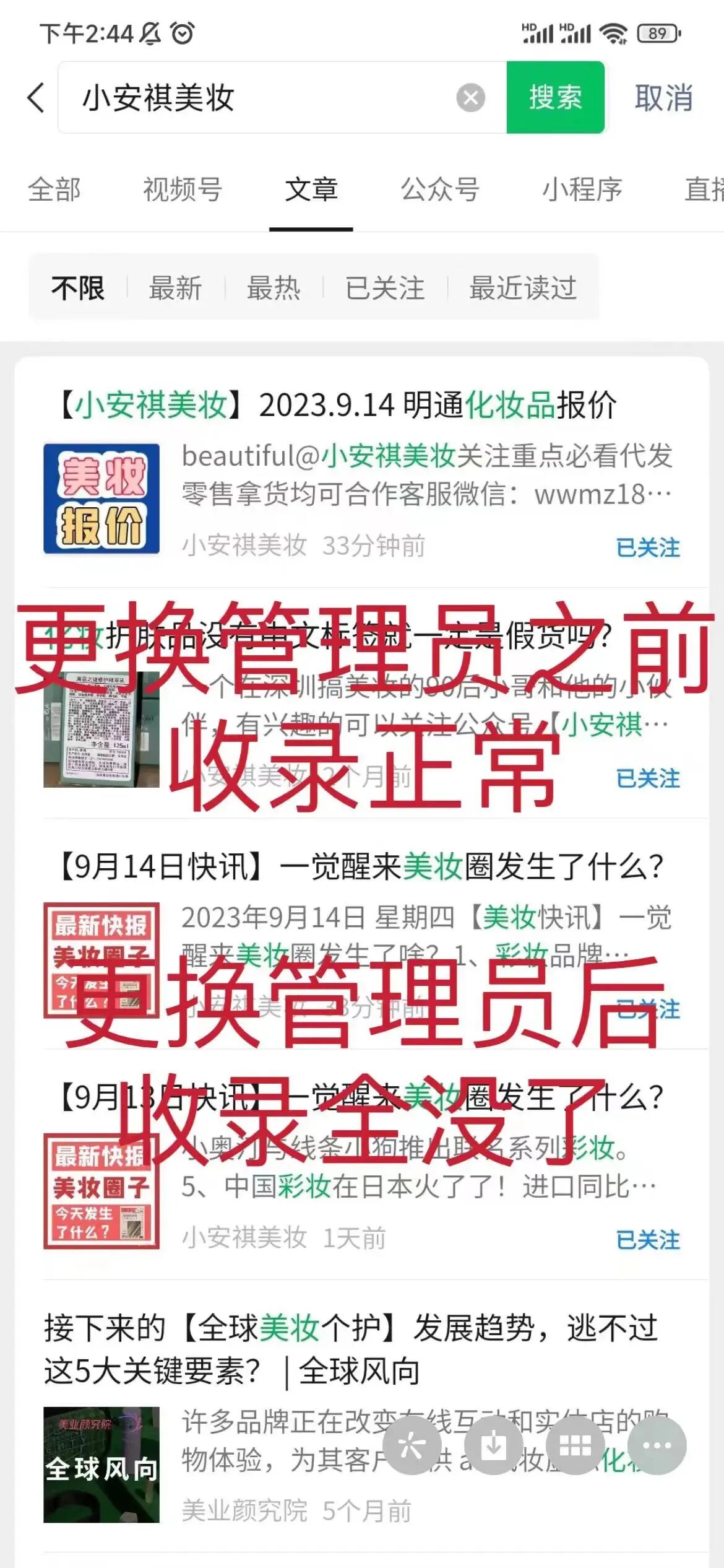 管理员你好,我13号更换了公众号的管理主体后,14号发布的文章还有收录,但是今天15号一看收录全没了,请问怎么回事?麻烦处理下,谢谢。