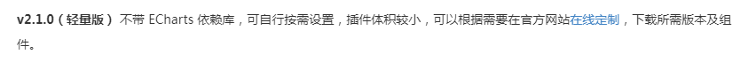 <p><strong>v2.1.0(轻量版)</strong> 不带 ECharts 依赖库,可自行按需设置,插件体积较小,可以根据需要在官方网站<a href="">在线定制</a>,下载所需版本及组件。</p>