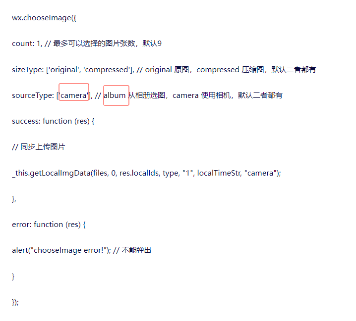 sourceType: ['camera'], // album 从相册选图,camera 使用相机,默认二者都有