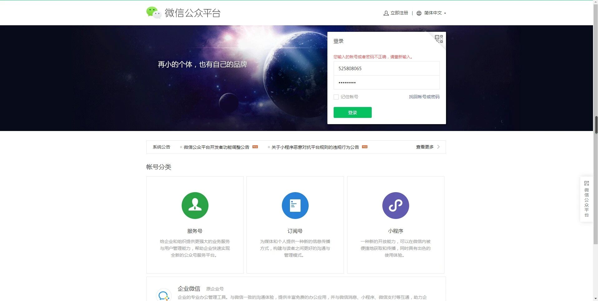 在微信开发平台登录,用扫一扫,手机端显示系统错误,请稍后再试。用账号密码登录,显示密码或账号错误