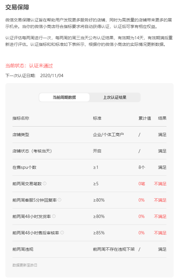 1、交易保障里面的四项‘前两周数据’,前三项我肯定是满足了的,但是还是显示红色“不满足”啊,为什么啊?