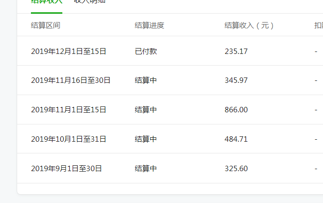 核实账号未及时补充财务资料,是在2019.12月初才补充的,2019.12月上半月开始才会有结算单,若前期有正常产生收益,后续我司会核实统一处理补结的,流程比较久,还请耐心等待后续留意,谢谢。