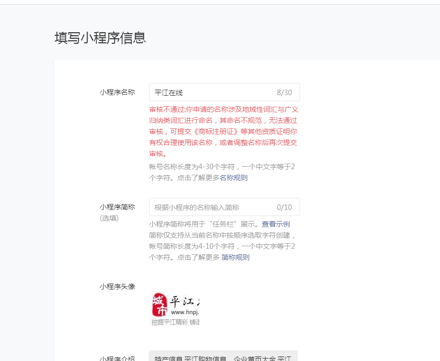 当前贵方的名称涉及以地域+广义归纳类词汇组合命名,存在对用户产生不适宜的混淆、误认、联想或影响,平台认为每个小程序的命名都应该是符合小程序内容,且有一定的辨识度,如开发者需要以地域+广义归纳类词汇组合来命名的话,建议开发者把主体字号也加上,具体名称规则可参考:https://developers.weixin.qq.com/community/operate/doc/00060288824708b8d588e4ae25bc01
