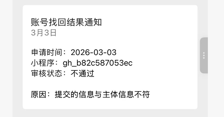 微信公众平台 找回账号, 一直不通过, 原因提交的信息与主体信息不符合?