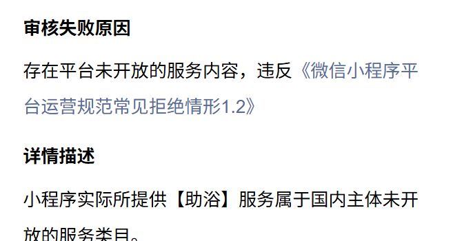 你好,经核实,小程序涉及【助洁】服务属于国内主体未开放的服务类目。建议移除整改后再提审,后续审核将以实际版本内容为准。