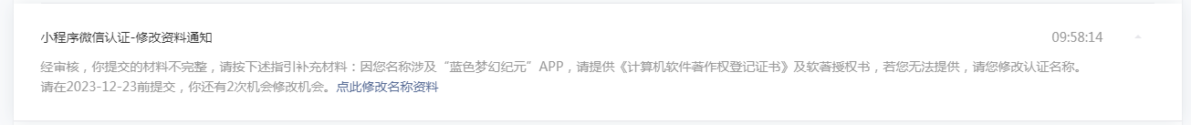 带着侥幸心里尝试小程序微信认证结果不出意外被驳回了!本来查过了,并没有找到与该游戏同名的APP,但那东西坚称说涉及同名APP,要软著及授权书......即使忍痛将名字稍作修改也不行!