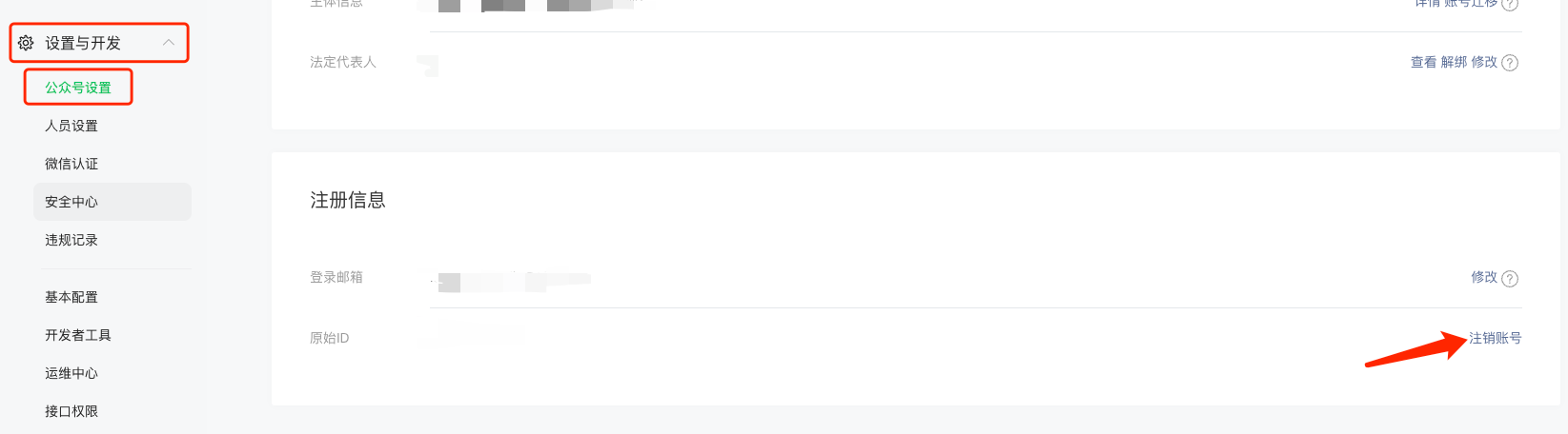 待主体名称修正后再前往【设置与开发——公众号设置——原始ID】自主注销账号,详情可参考文档:https://kf.qq.com/faq/220309bUvmIB220309BbAjMz.html