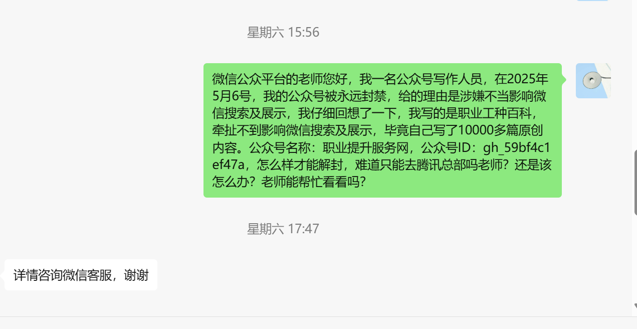 微信公众平台的老师您好,我一名公众号写作人员,在2025年5月6号,我的公众号被永远封禁,给的理由是涉嫌不当影响微信搜索及展示,我仔细回想了一下,我写的是职业工种百科,牵扯不到影响微信搜索及展示,毕竟自己写了10000多篇原创内容。公众号名称:职业提升服务网,公众号ID:gh_59bf4c1ef47a,老师们 请帮我解封吗?你们也是来回踢,你们让我联系客服,客服让我联系你们。
