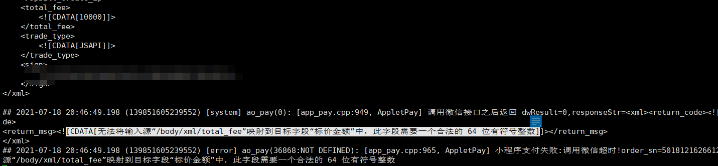 {"return_code":"FAIL","return_msg":"无法将输入源“/body/xml/total_fee”映射到目标字段“标价金额”中,此字段需要一个合法的 64 位有符号整数"}