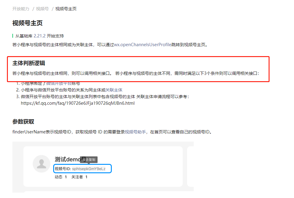 采用 wx.openChannelsUserProfile 跳转视频号首页是否有主体限制,目前实测开版,体验版,生产都没有限制