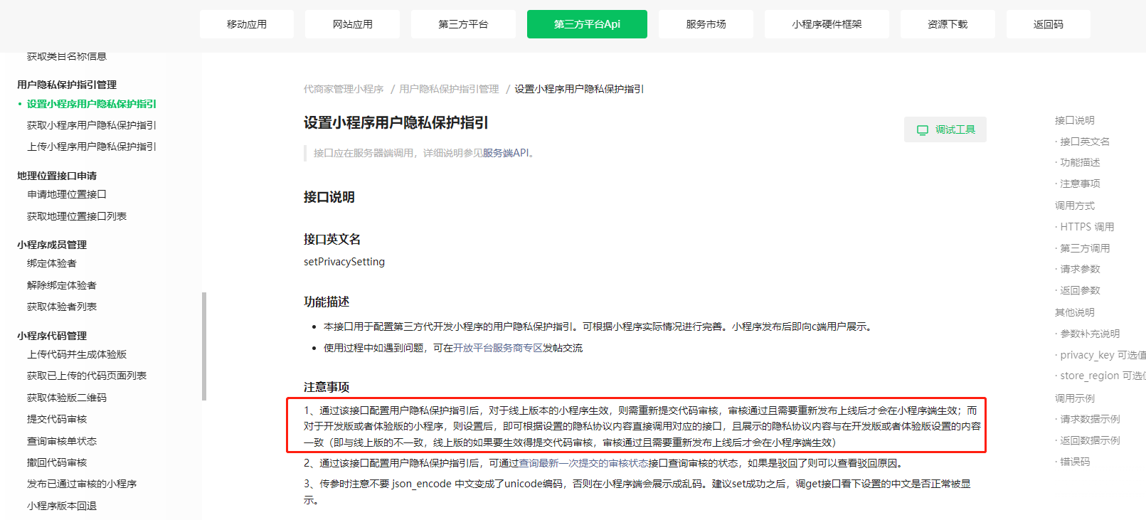 另外,也请查看文档最新注意事项说明:https://developers.weixin.qq.com/doc/oplatform/openApi/OpenApiDoc/miniprogram-management/privacy-management/setPrivacySetting.html