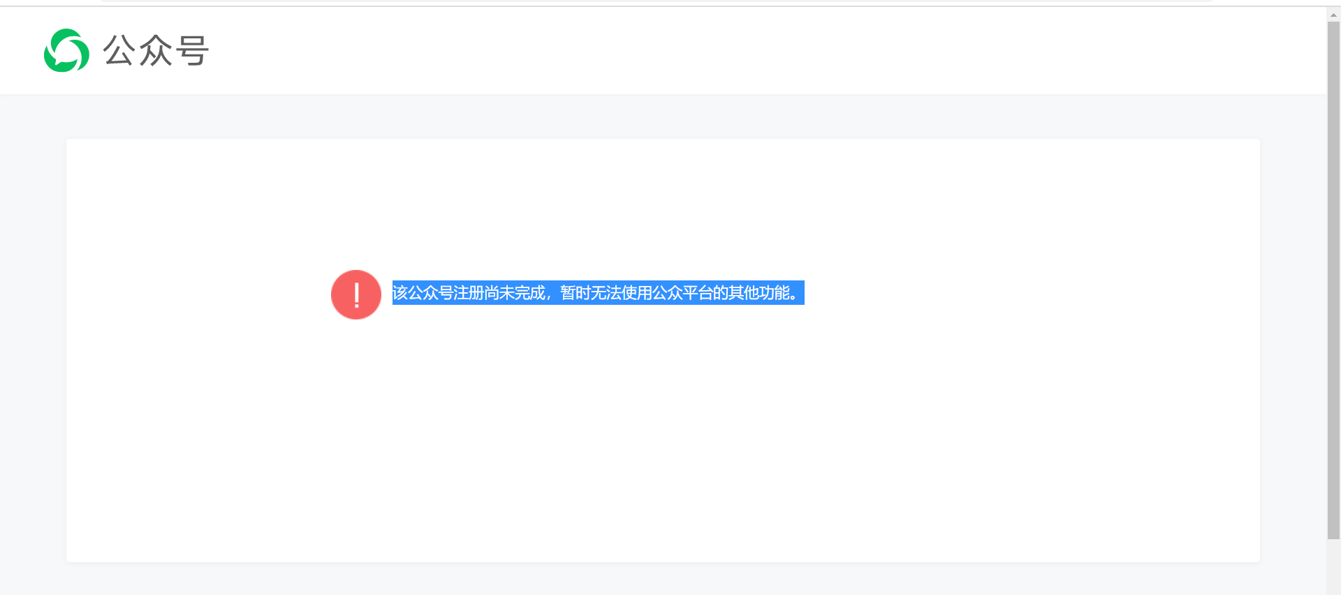同问,我也是这个问题,个人注册的,等正常登陆后台,但所有功能点击后都出现:该公众号注册尚未完成,暂时无法使用公众平台的其他功能。